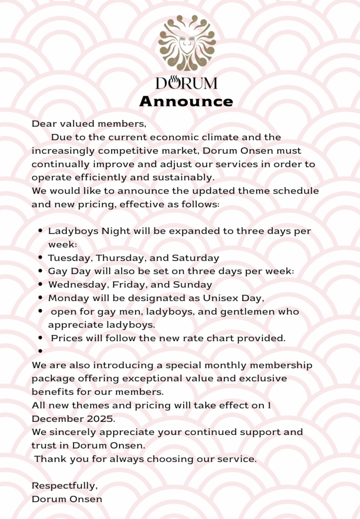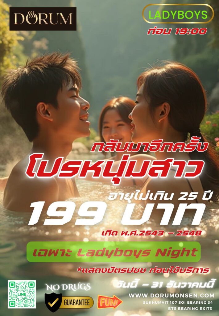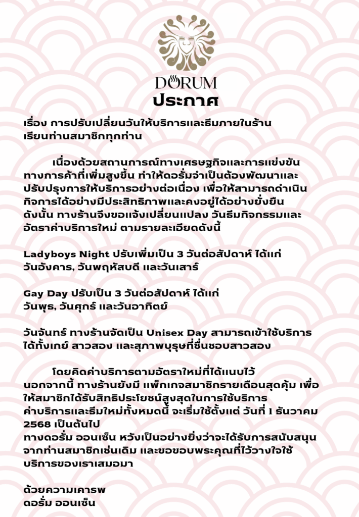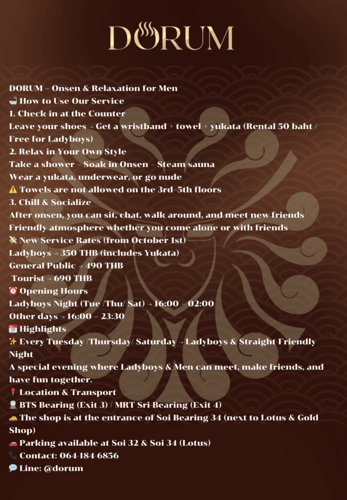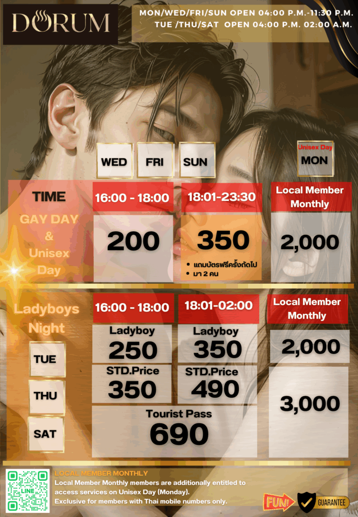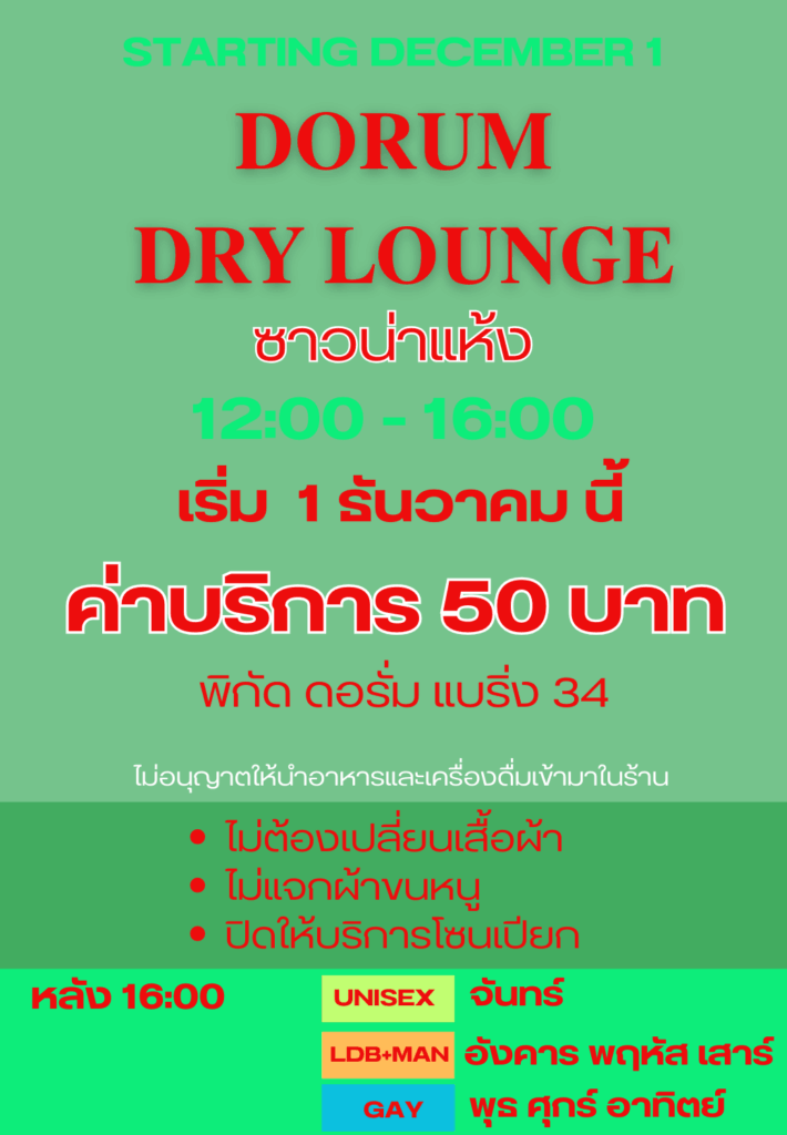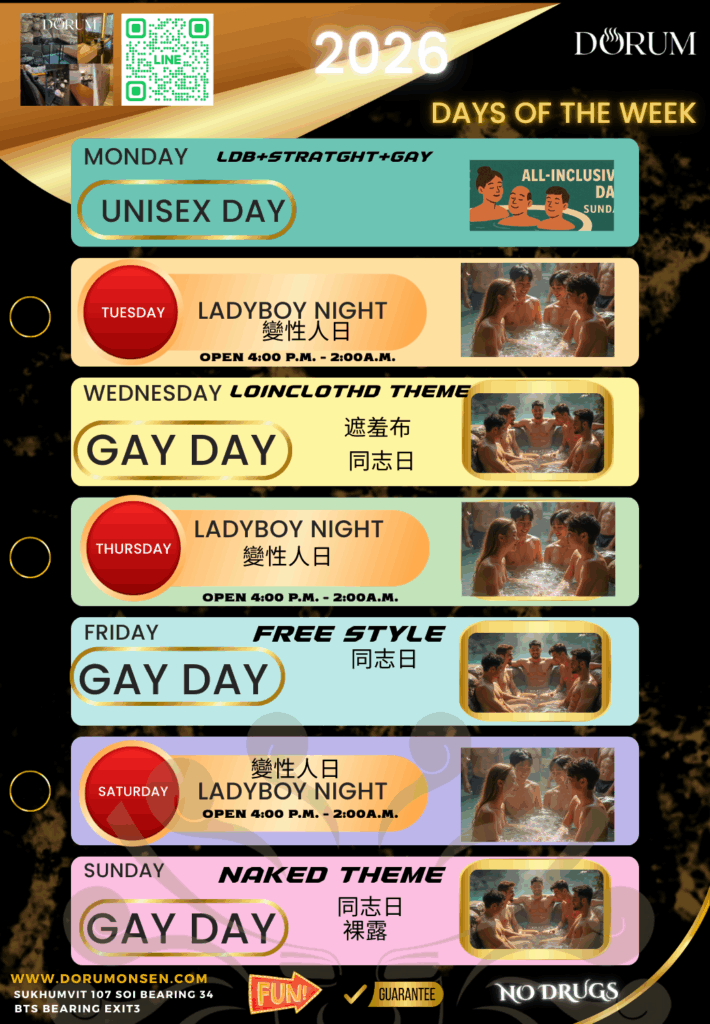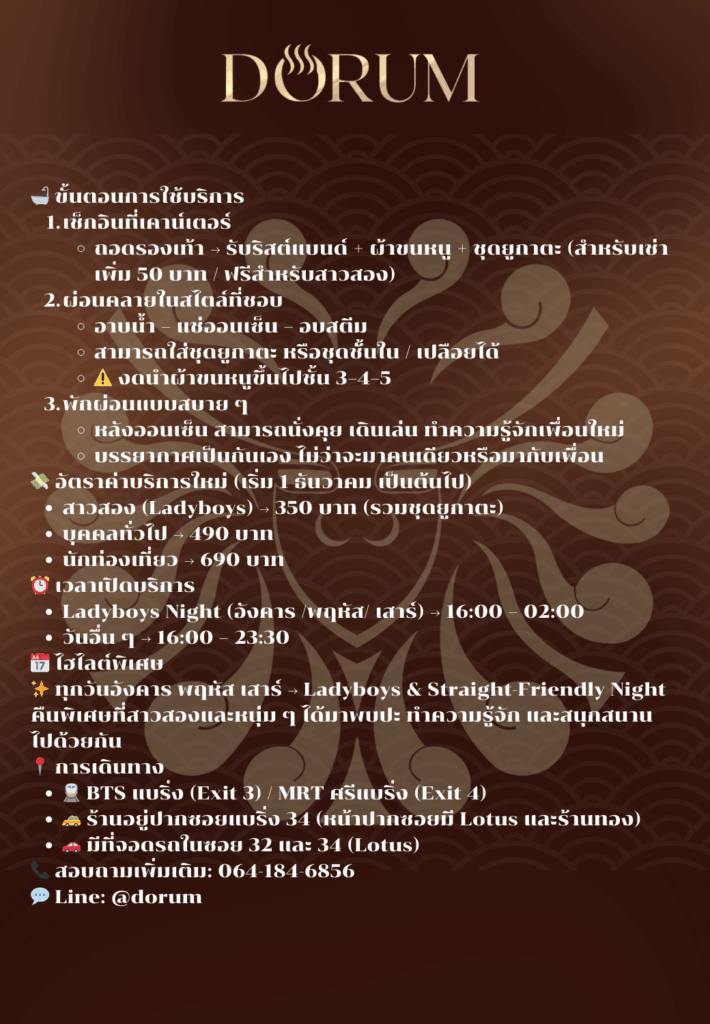 ดอรั่ม สถานบริการ แช่น้ำ อบสตีม สำหรับกลุ่ม LGBTQ+ โดยให้บริการกลุ่มเกย์ ชายรักชาย และกลุ่มสาวสอง และชายที่ชอบสาวสอง สามารถมาใช้บริการได้ทุกวันอังคารและวันเสาร์ (Ladyboys Night Open Tuesday /Thursday/ Saturday)